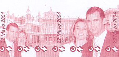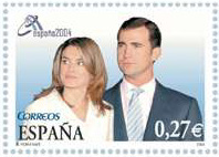 El próximo 24 de mayo Correos sacará a la calle un sello que conmemorará el "acontecimiento histórico" que supondrá la boda entre el Príncipe Felipe y Letizia Ortiz. Con un valor de 0,27 céntimos de euro y una tirada de 525 000 ejemplares, será el primer sello sobre bodas reales que emite Correos en toda su historia, según informaron desde la entidad postal. Este sello, que formará parte de un hoja-bloque denominada 'Monarquía', ha sido el resultado de una petición que Correos solicitó a la Casa Real a los pocos días de conocerse el compromiso oficial del Heredero al Trono, el pasado 1 de noviembre de 2003 para conmemorar este acontecimiento. Correos consideró que la Exposición Filatélica Mundial Valencia 2004, que se celebrará entre el 22 y el 30 de mayo, sería un "marco ideal" para poner en circulación el sello. Contendrá el texto en las 4 lenguas oficiales en España (castellano, catalán, gallego y vasco). Así, la imagen de la pareja que ilustrará el sello ha sido elegida por la propia Casa Real entre las fotos oficiales de la pareja. El sello irá dentro de un bloque junto a otros dos sellos con las imágenes de los Reyes de España y del Príncipe Felipe, respectivamente. El primer sello del Príncipe Felipe se emitió el 22 de diciembre de 1977, con motivo de su nombramiento como Príncipe de Asturias en la Basílica de Covadonga. En 1979 se puso en circulación otro sello, conmemorando el centenario del Hospital Niño Jesús, del que es Presidente de Honor. El sello dedicado a la boda se enmarca, junto a otros dos y tres viñetas, bajo el eqígrafe 'Monarquía'. Los motivos de las viñetas son la Catedral de la Almudena y los Escudos Oficiales del Rey y del Príncipe de Asturias, y los dos sellos reflejan, además de los contrayentes, las efigies de los Reyes de España y una imagen de Don Felipe. El sello está impreso, al igual que los otros dos que completan la hoja-bloque, en calcografía y offset, en papel estucado, engomado y fosforescente. Tiene un dentado de 13 tres cuartos y su formato es de 40,9 por 28,8 milímetros, siendo el de la hoja bloque de 163,6 por 86,40. El valor postal del sello es de 0,27 céntimos, el de los Reyes de España de seis euros y el del Príncipe de Asturias de 0,77. Cartel para engalanar los comercios de Madrid