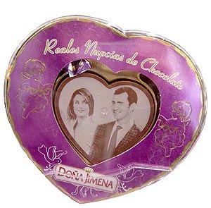 Ella, Letizia, mira a su príncipe con deseo. La imagen que ilustra esta caja de "Nupcias de Chocolate" firmada por Doña Jimena, no se ha elegido al azar. Se trataba de que la propia protagonista transmitiera apetencia al consumidor. Un par de cupidos y dos pajaritos custodian el corazón.