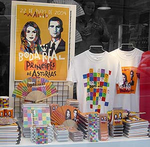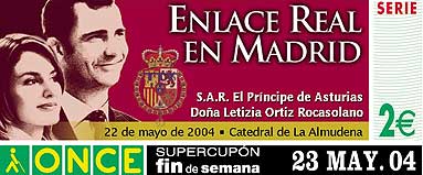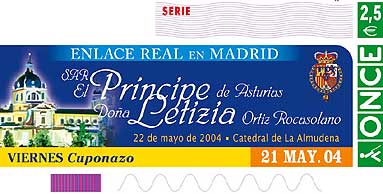 Cerca de 200.000 establecimientos de la Comunidad de Madrid mostrarán a partir del próximo viernes en sus escaparates el cartel conmemorativo del enlace del Príncipe Felipe con doña Letizia Ortiz el próximo 22 de mayo, que lleva por lema "Madrid, testigo de la historia". Billetes de Renfe y cupones de la Once Cupón de la Once o billete de Cercanías , usted elige. Renfe comercializará entre el 15 y el 30 de mayo un billete conmemorativo de la boda real y destinará la recaudación a la Fundación Víctimas del Terrorismo. La Once ha creado dos cupones, para los días 21 y 23 de mayo, en homenaje a la Casa Real.